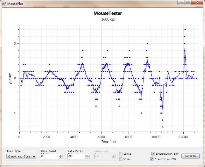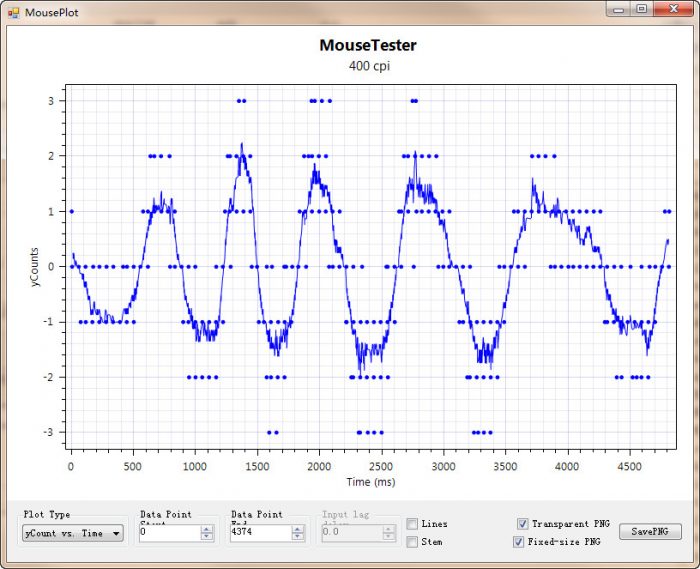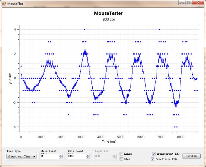 接着用mousetester测试一下Razer Viper的yCounts Vs time,下面五张图分别代表400DPI、800DPI、1600DPI和3200DPI的yCounts Vs time图,可以看到这四档DPI下,都没出现大量丢帧情况。虽然在3200DPI下,出现了些许抖动,对于一些适合了低DPI的用户来说,可能觉得鼠标有些飘。