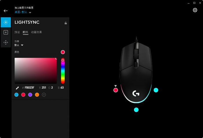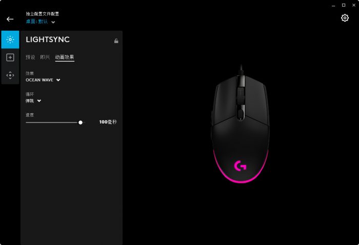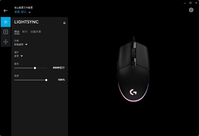 对于罗技G102来说,灯带设置是必不可少的,其中有预设、即兴、动画效果等多种设置。