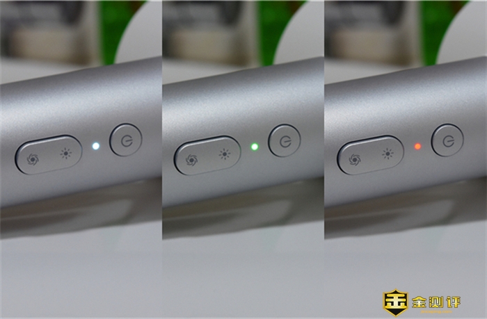 两颗独立按键之间为温度指示灯,在冷、暖、热3档温度模式下指示灯分别呈白、绿、红色显示。