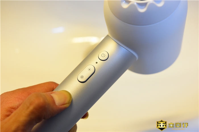 轻触式按键,轻轻一点即可。长按电源键2秒可开/关机,同时它还配备了3档温度:冷风、暖风、热风,以及3档风速:柔风、大风、暴风。