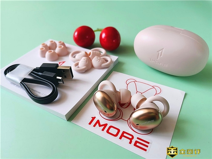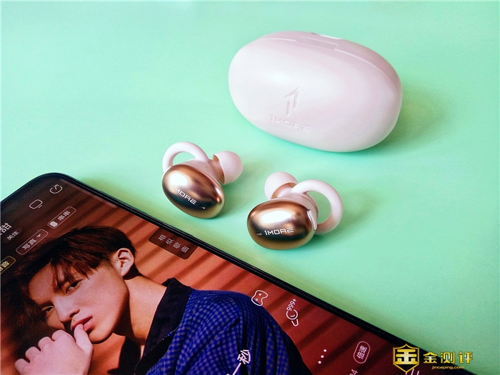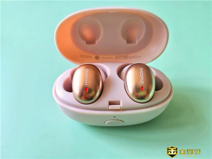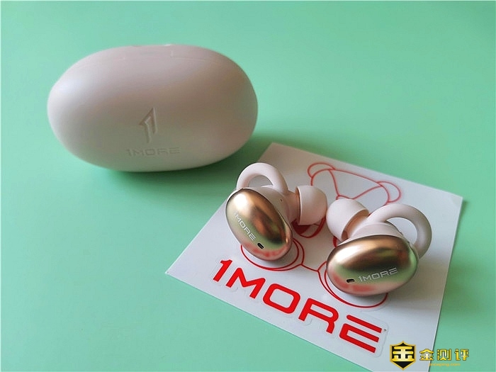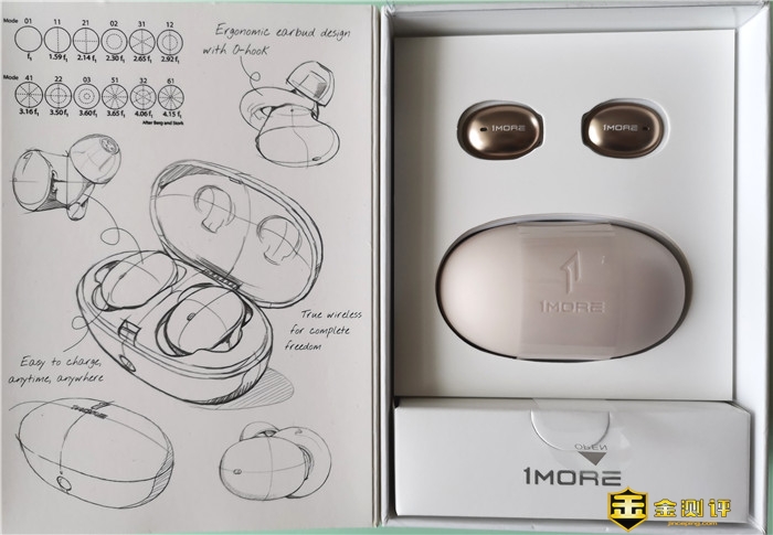 打开包装盒呈现在我们眼前的是万魔时尚豆蓝牙耳机主机身及充电仓,耳机正面呈流光金色,1MOR LOGO闪亮其上,充电仓呈米白色,二者内嵌白色内衬之中,这样既可以固定产品本身,防止产品在运输中磨损或碰撞,又可以突显产品的气质。