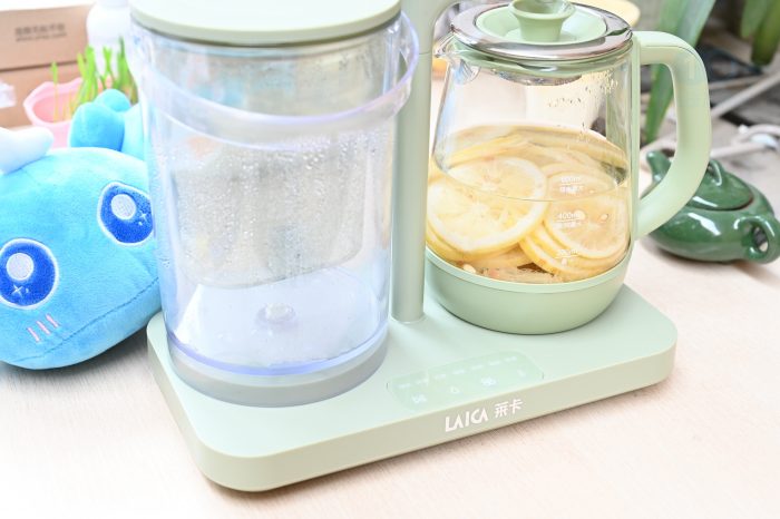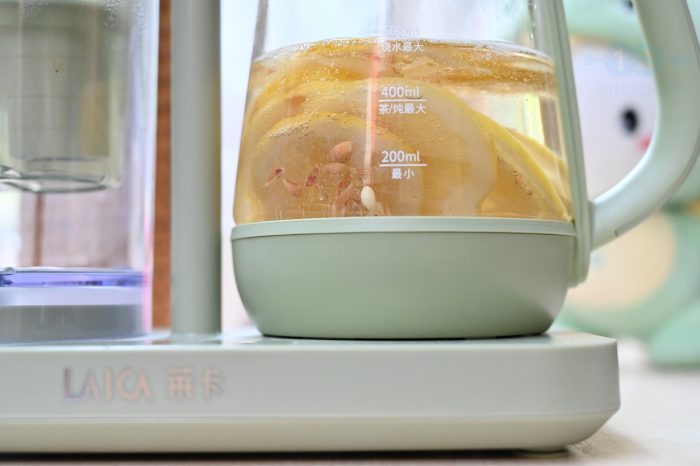 在烧水、煮茶等简单的功能之外,莱卡KE9403净饮机也可以充分发挥养生壶的优势,通过滤煮法和滤炖法调制不同类型的健康饮品。比如在壶中放入柠檬、大枣、谷物等食材,然后给壶中加水,选择对应的模式,短短几分钟就可以获得自己喜欢的饮品。