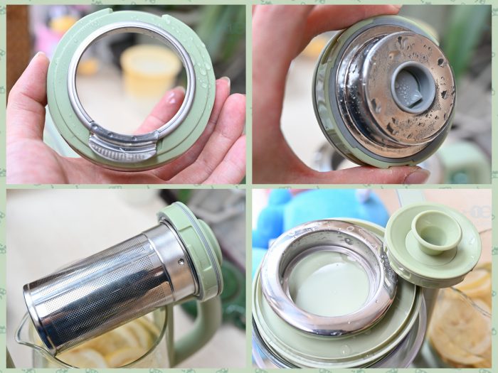水壶的盖子设计很有特点,是一种双层设计,内盖除了带有滤网的进水口外,还采用了旋拧的开合方式,并且能和滤网进行契合,算是一个多功能的小工具,可以大大提升日常使用的便捷性。而外盖则可以用来固定炖盅,拆下之后也便于对水壶内部进行清洗。最后,水壶的开口处也有金属滤网,可以过滤茶叶和食材残渣。