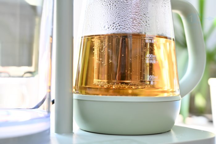 这款养生壶的热水壶部分采用了玻璃材质,并且标有刻度,便于在日常加水时作为提示。除了通过顶部盖子的入水口从滤水水箱获取水源外,平时也可以直接将矿泉水或是牛奶等需要加热或蒸煮的饮品直接倒入水壶。