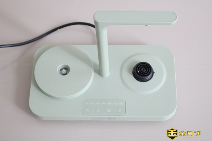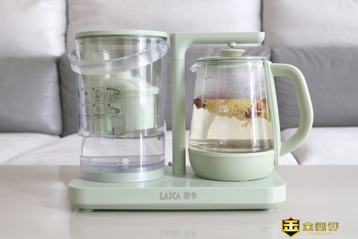 小编手中这款莱卡MINI养生净饮机为牛油果绿色,外观设计是采用净水机与煮壶的相结合的方式,满足我们日常饮用水及炖煮。底盘尺寸为A4大小,与其说是养生净饮机更像是把简易的茶盘现代化,更加适合摆放在简约的家中及办公桌上。