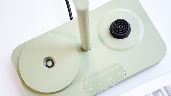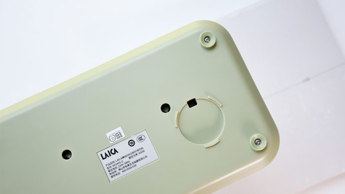 机身整体设计比较简洁,我收到的这款是抹茶绿配色的,表面辅以哑光质感。底座部分是一个圆角矩形,长宽分别为28*16cm,高度大约2cm左右,放在桌面上并不会过多的占用空间。