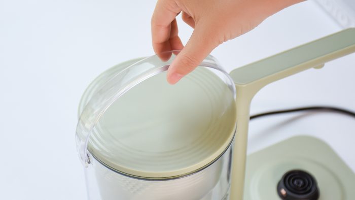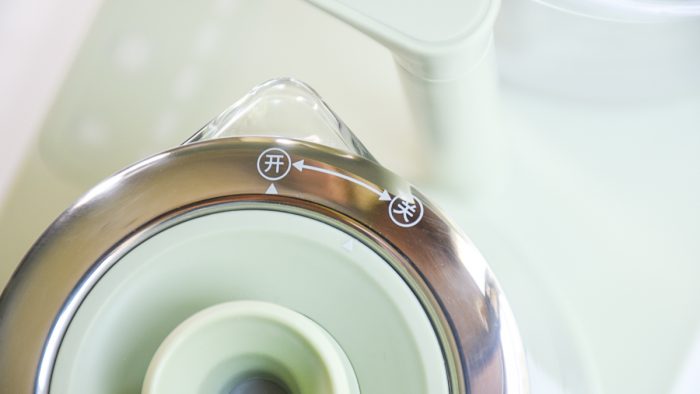 顶部盖子设计有安全卡扣,旋转至开一侧方可拿起,旋转至关一侧则与水壶锁死,避免在烧水过程中壶盖掉落烫伤的问题,非常贴心的设计。