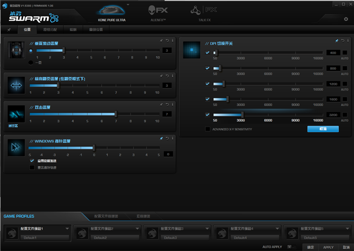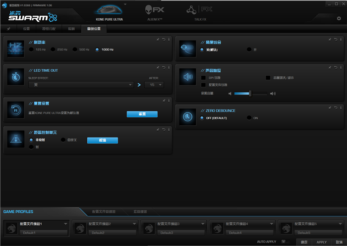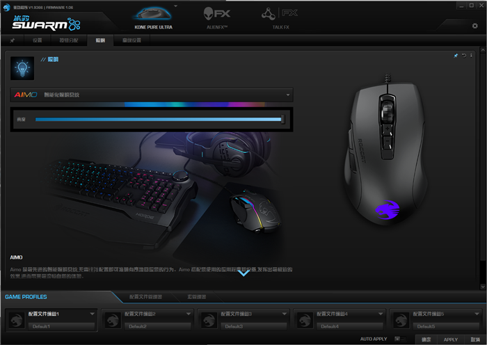 ROCCAT Swarm软件的界面设计也是炫酷的风格,我们可以使用软件对鼠标进行设置、按钮分配、照明(灯光调节)等等设置,打造属于自己的炫酷灯光系统。