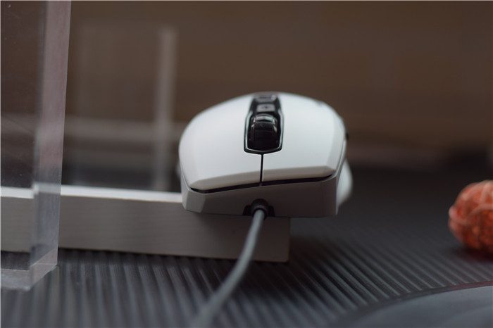 鼠标前部的滚轮的手感不错,并且设计有纹理材质进行防滑。滚轮的西方设计有2个独立的DPI调节按键,并且标示有“+”“-”符合,可以根据需要调节鼠标的DPI。