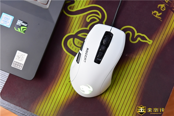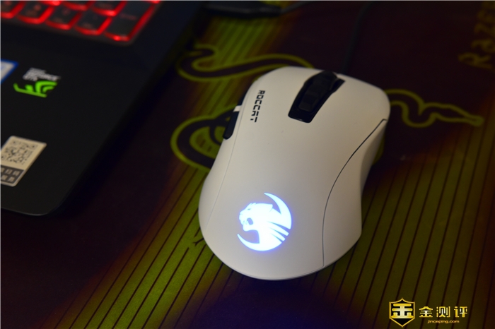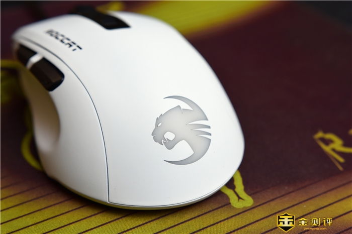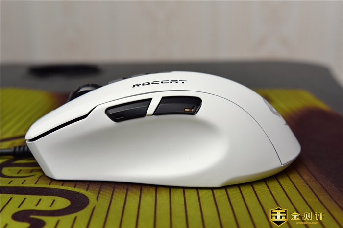 鼠标上方依次为其滚轮、DPI“+”、“-”调整按键,侧面为ROCCAT的冰豹英文LOGO。