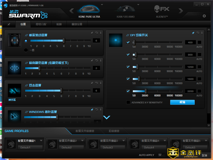 软件功能层面,冰豹的外设均使用SWARM软件作为游戏、应用以及产品的整合。首页我们可以对垂直滚动速度、横向翻页速度、双击速度、WINDOWS指针速度以及DPI切换开关进行设置和调整。