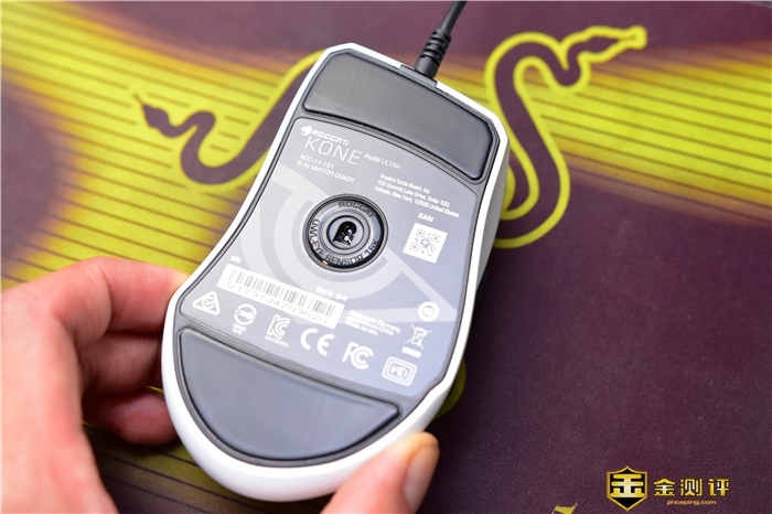 鼠标底部的上下两端为脚垫,中间部分介绍了其一些参数和相关信息。这款KONE PURE ULTRA传感器采用了夜枭之眼的二代引擎,为鼠标提供了全新的协同支持,传感器可进行100~16000的dpi配置,控制更加精细。