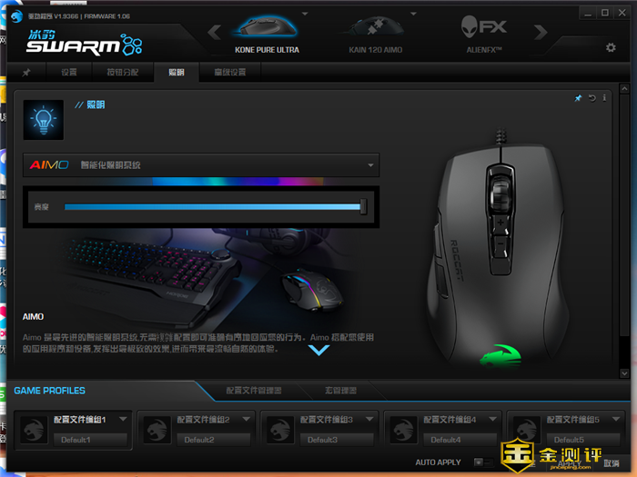 照明部分可以对鼠标的AIMO智能化照明系统进行调整,包括照明的呈现方式(波浪、全亮、心跳、呼吸及闪烁)以及亮度都可以在这里更改。