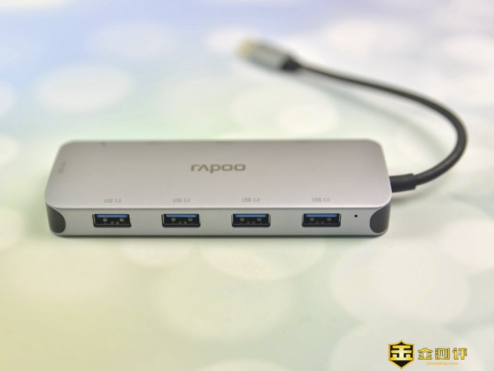 雷柏XD200 USB-C 10口扩展坞的三围是275*45*15mm,重量为98克,从体积重量来说,是很小巧便携的。雷柏XD200 USB-C 10口扩展坞采用优质铝合金一体式外壳,表面经过喷砂工艺处理,手感好,散热快,并且耐磨防腐蚀。机身的中间印有雷柏的Logo。
