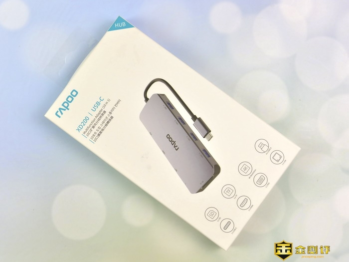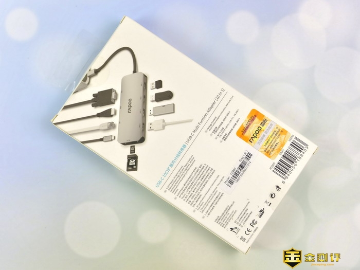 雷柏XD200 USB-C 10口扩展坞的包装盒很小巧,左上角是雷柏的品牌Logo,右上角是HUB的类型,中间是产品的渲染图,下方则是接口的介绍。包装盒的背面介绍了产品的相关信息。