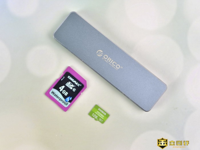 接下来我准备测试USB接口、SD卡槽和microSD卡槽的性能。所以我准备了一个内置500G M.2硬盘的移动固态优盘,一张4GB的SD卡和一张128G的microSD卡。