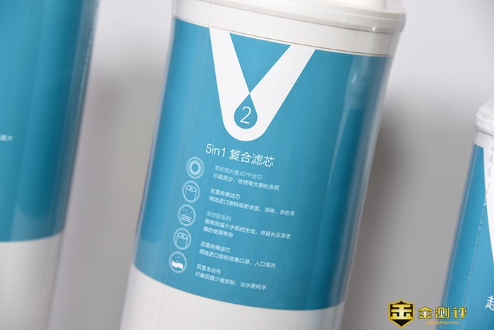 而2号滤芯是一个五合一的复合滤芯,相当于普通RO机,除RO滤芯外的其它部分。第一层是PP棉滤芯,主要用于滤除泥锈、铁砂等大颗粒物质;第二层是颗粒活性炭,主要吸附余氯、异味、有机物;第三层是高效阻垢剂,起到初步软化水质的作用。第四层也颗粒活性炭,不同于第二层,它的主要作用是改善口感。而第五层无纺布,主要是保护拦截活性炭。