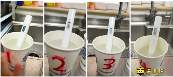 净水器自洁后,就可以测试了,需要说明一下就是,云米互联网净水器Q5是双出水,所以净水与纯水都要分别自洁一次。1-4号水杯分别为自来水、净水、纯水,品牌净水。