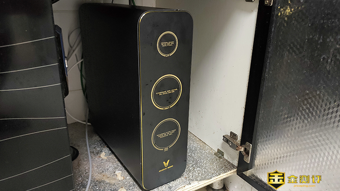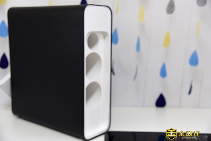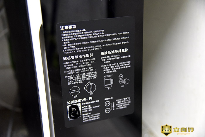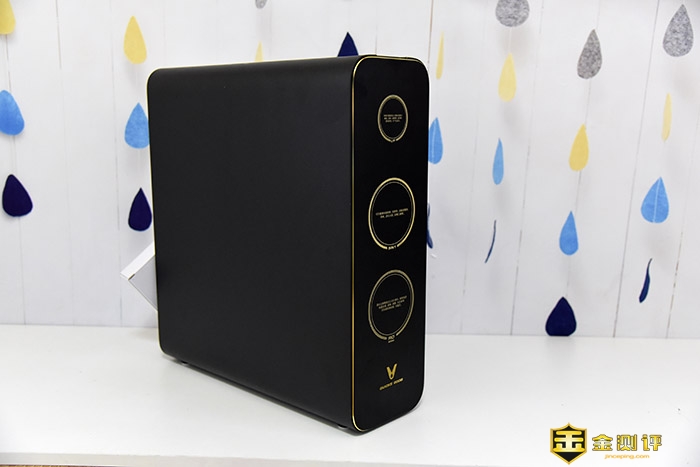 我这款机器是曜石黑配色,主体为黑色,前面板以金色包边装饰,显得比纯白的同样竞品更上档次。前面上印有三个滤芯的示意位,我们可以提示安装滤芯。