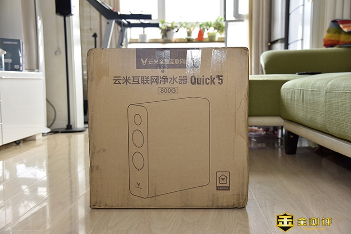 云米净水器Q5的外包装是经济的黄色牛皮纸箱,正面印有产品的全称,云米互联网净水器Quick 5,以及产品的线构图。Quick,很熟悉的英文单词,大家应该都知道这是快的意思。800G的通量,就目前来说,是民用净水器中最快的一个量级。