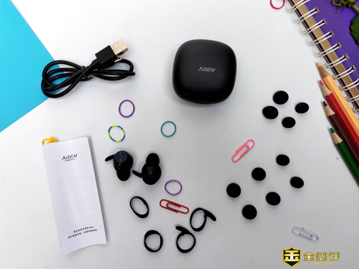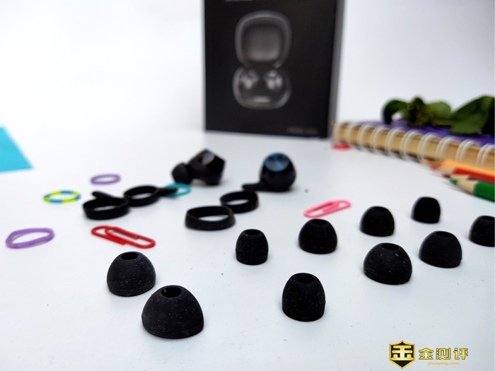 所有产品的配件和耳机主体包括:充电仓1个,Type-C 充电线1根,6副耳帽,其中1付已经套在耳机上,1对犀牛角式耳塞套,使用说明书1本以及产品合格证等。下面来一张全家福看看他们的容貌。