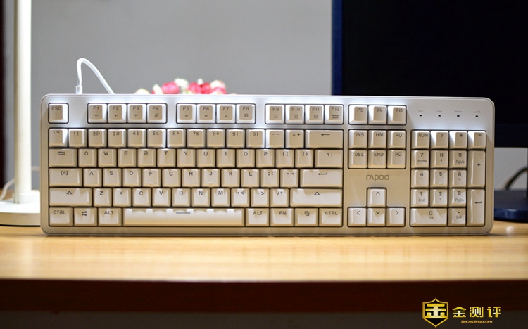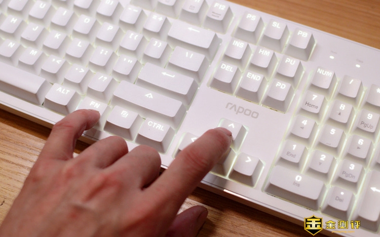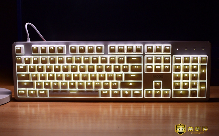 键位布置和排列,继续延续了雷柏键盘一贯的简约大方,另外这款键盘的键帽是采用双色注塑形式,键帽上显现的字符,实际上是采用半透明材质塑胶整体注塑的,跟普通市面上的那种印刷字体最大的区别在于,印刷的字体如果经常使用会磨损看不清,而这款键帽就不用担心了