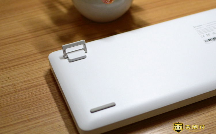 键盘底部后端的防滑支架,可以撑开调节,倾斜角度也是非常的自然舒适,如果喜欢放平操作,也可以把支架放下来的