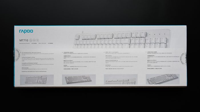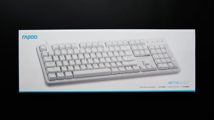 包装方面延续了雷柏家族式的设计语言,整体为蓝白拼接配色,正面印有MT710键盘的渲染图,左上角印有雷柏的Logo。