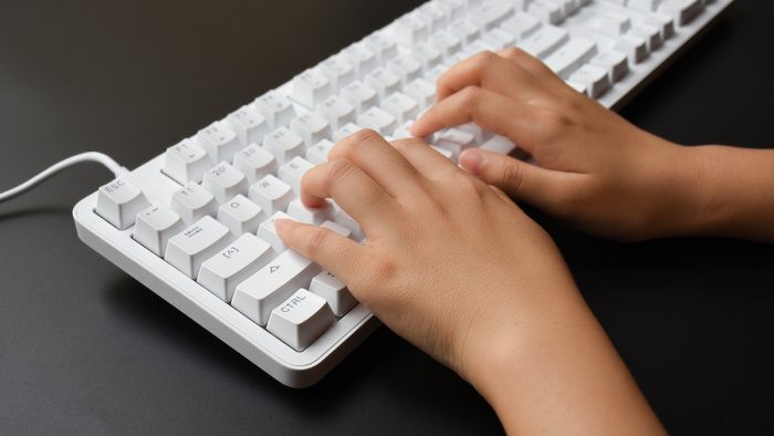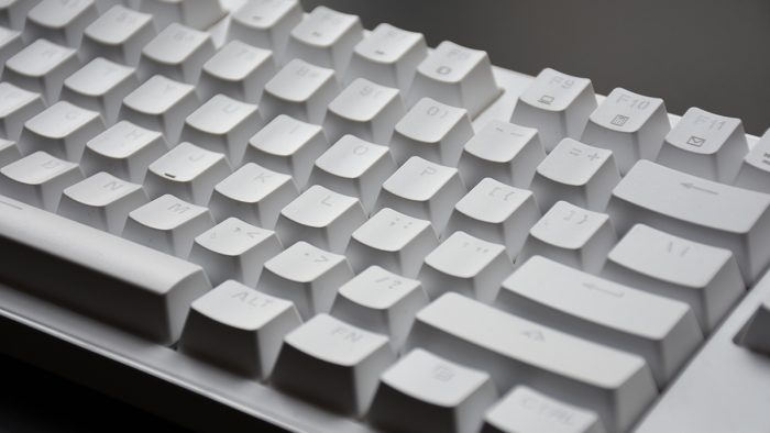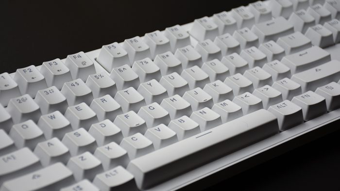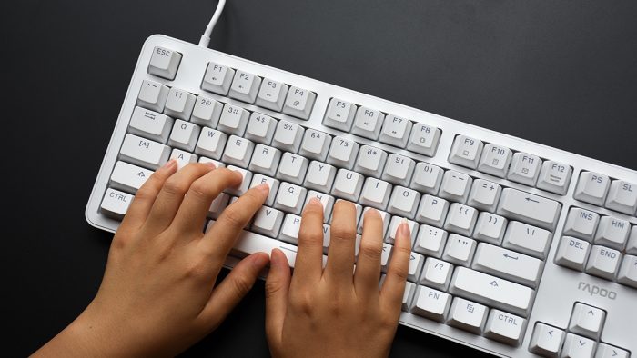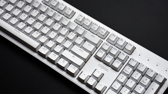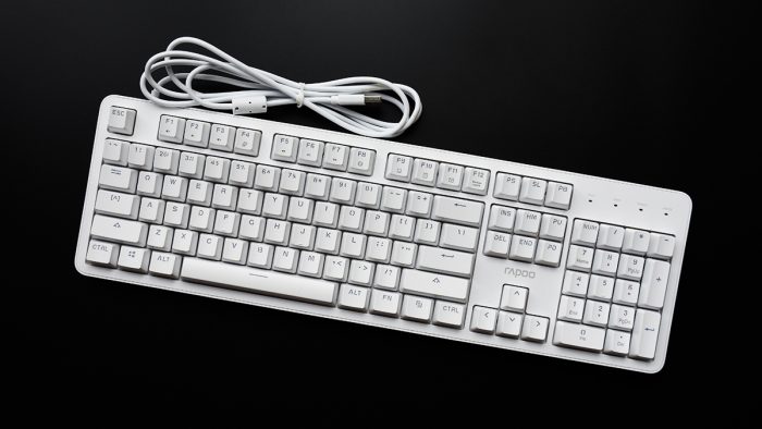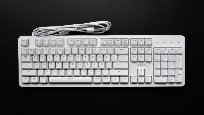雷柏MT710的定位是一把办公键盘,所以在外观方面并没有花里胡哨的另类点缀,整体采用白色ABS材质成型,表面辅以细微的雾面磨砂质感,在视觉和触觉上营造出一种温润舒适的感觉。加之优雅的配色,也能与大多数现代化办公桌面完美融合。