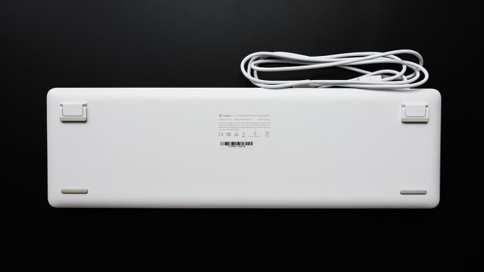 键盘背部也十分规整,后方左右两侧各有一个可以打开的支撑脚,前方两侧为橡胶脚垫,避免键盘底部与桌面刮擦,同时也能起到一定的增稳作用。