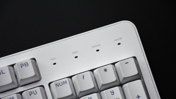 右上角数字键盘区上方分布有四颗指示灯,依次为数字键盘区、大小写、Windows锁定和MacOS模式;方向键上方印有灰色的雷柏Logo字样。