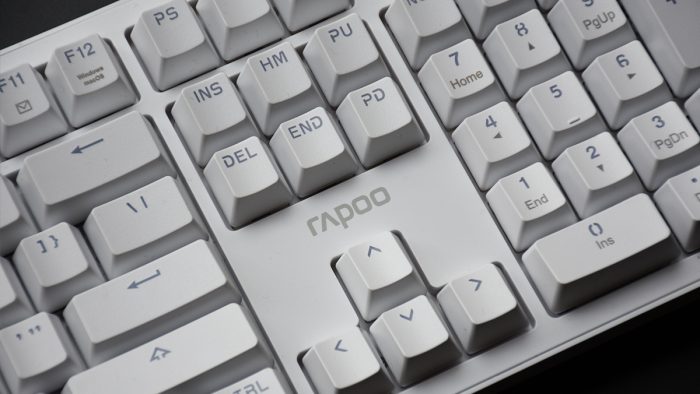 雷柏MT710的键帽采用PC+ABS双色注塑工艺,表面呈现细微的颗粒触感,能够有力的支撑日常打字敲击,触感也比较舒适。键帽上的文字为印刷工艺,灰色字样,字体也是雷柏办公系列一贯比较粗大的风格,比较易于辨认。