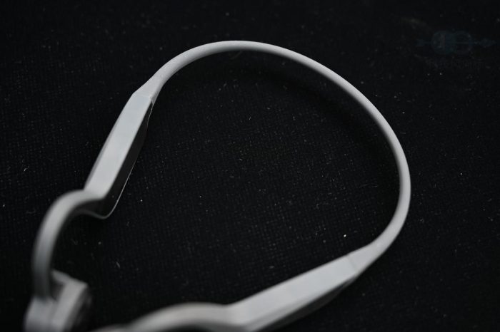 耳机挂在耳朵后面的左右两个模块有一定的配重作用,设计风格上也有一定的运动感,同时内侧也采用了橡胶材质,具有良好的防滑表现,其中主要的按键和充电接口位于右耳这一侧,开关和播放暂停键在扬声器外侧,而音量加减键则位于耳后下侧,不过按键的手感相对一般,而且偏小,操作体验也一般。