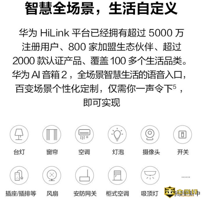 AI智能音箱是华为从芯片+OS+终端全面战略性布局中重要的一环,智能时代万物皆可互联,作为华为旗下的智能音箱,华为HiLink平台目前涵盖了市面上100多种类生活品类的智能家居产品,可通过AI语音交互体验与智能家电设备的互联;华为HiLink有效的整合各种不同的智能终端,平时只需要一个语音命令就可以实现全屋智能设备的控制,开关空调、调节灯光、开闭窗帘、摄像头、插座/排插、风扇、安防网关、扫地机器人等等设备。