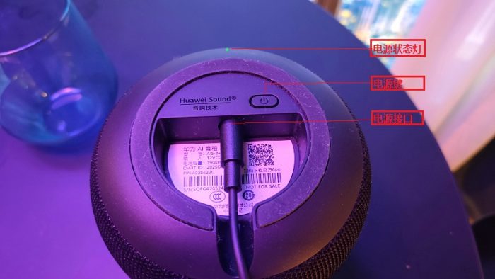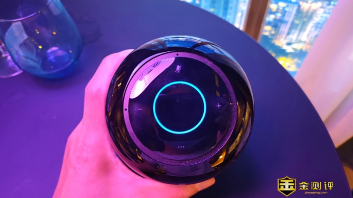控制区在音箱的顶部,触控操作方式,在圆盘的凹槽内的小孔是全方位360°无死角的麦克风,在一间20平方米房间的任意位置只需以正常音量呼唤“小艺小艺”音箱立马就能做出响应;目前体验下来有顶部LED有三种颜色显示不同状态(不知道是否还有更多颜色),在语音唤醒及一碰传音时会随声而闪烁蓝色灯带,触摸控制区有四个触摸按键,分别是静音、音量加音量减和多功能按键,在实际使用中,完全可以忽略掉操控面板,我们在大部分的情况下,直接呼唤小艺加大音量播放与暂停就OK了,华为音箱支持强制静音,方法很简单用播放过程中,手掌朝着控制面板,随手一拍,音箱立马启动静音功能,并伴有红色的呼吸灯,系统升级会伴有绿色灯带。