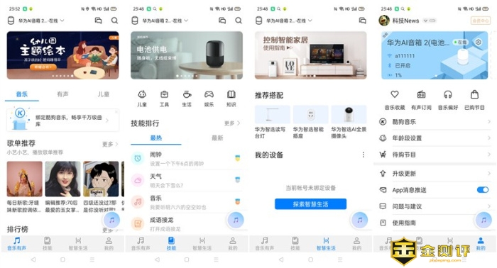 华为音箱2 APP应用界十分清爽,界面共分为四大版块,分别是音乐有声、技能、智慧生活以及我的;在音乐有声里的页面,提供了上千万的正版音乐曲库,曲库内容由华为音乐和酷狗音乐提供,并支持无损音质播放,海量有声内容基本能够满足大多音乐发烧友对高品质音乐的需求。在音乐有声里的页面不仅仅有音乐,还涵盖整合了喜马拉雅、懒人听书、今日头条、樊登读书会、蜻蜓FM、口袋故事等有声资源,除上述外内容外华为音箱更为小朋友而打造的儿童学习内容版块,包括儿童故事、贝瓦儿歌、趣味百科、故事城堡、国学启蒙、磨耳朵英语、绘本故事,涵盖了小孩子学习,寓教于乐有关的一切;这几天可愁了因为我家的小宝天天抱着音箱爱不释手,故事、儿歌、百科、样样都要听...