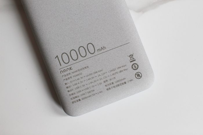 背面的底部详细标示了南卡POW-2无线充电宝的各项性能指标,10000毫安时的大容量可以保证身边多款数码设备供电,同时又能够安全带上飞机使用。