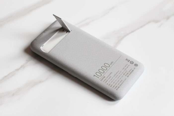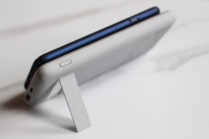 把南卡充电宝POW-2翻个身, 可以看到背面有一个小巧的折叠支架,可以让充电宝立在桌面,这样就可以一边无线充电,一边追刷、使用手机了。