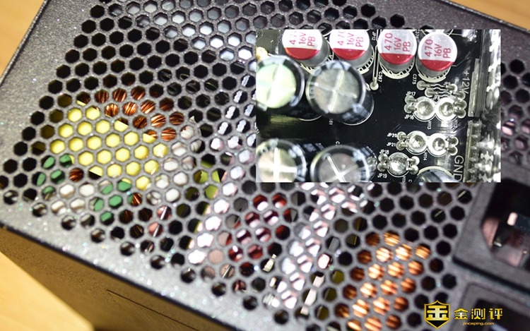 这台AJ-650M,采用了全日系电容,耐高温105℃的电解电容,能够保障供电系统在高温情况下依旧稳定运行,从而确保了电脑硬件供电效果。话说这块电源设计非常紧密,我拆了半天竟然都没能打开盖子,所以只能从散热孔缝中看到一些内部的结构