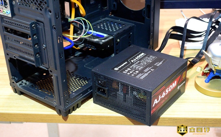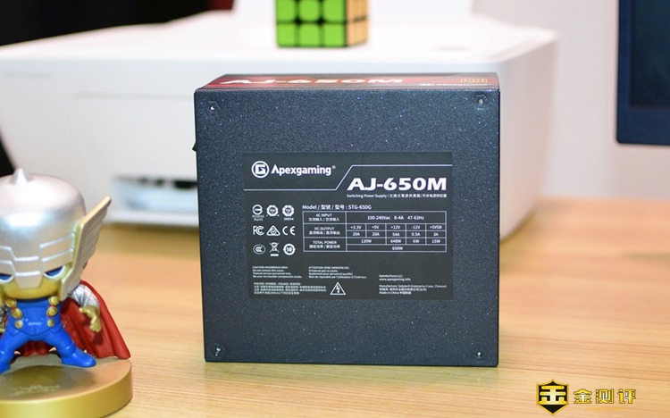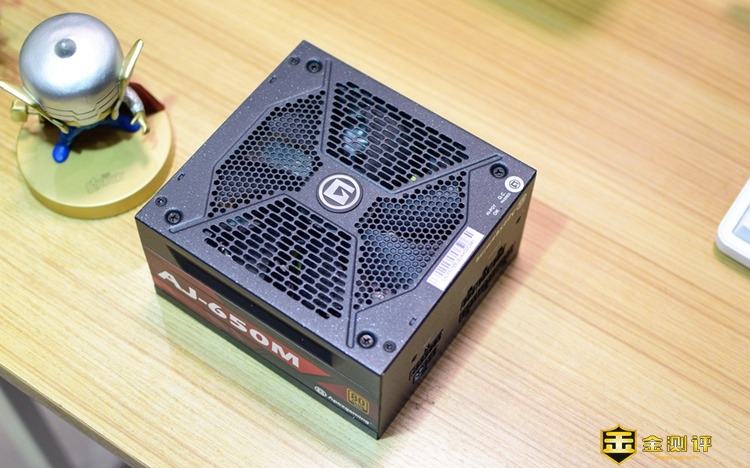 电源的一侧,醒目的印着AJ-650M的规格标识,同时还印了一个“80 PLUS GOLD”的认证标识,小编百度了一下这个标识,其实它最早是在美国能源署实施的节能计划,要求电源在各种负载下,电能转换效率不低于80%,且分为白牌80%;铜牌82%;银牌85%;金牌87%等标准