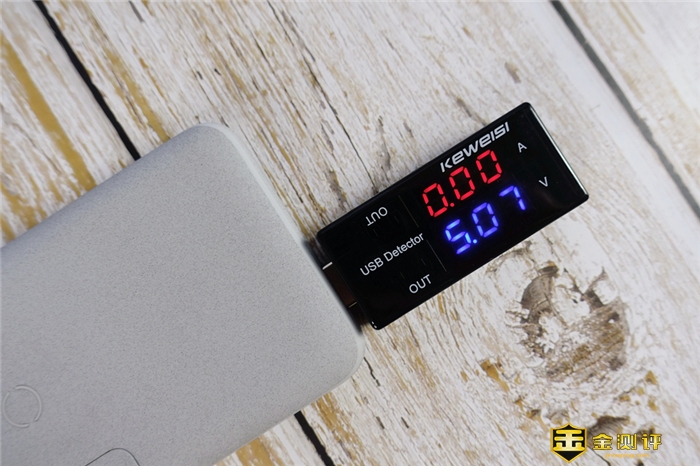 为了测试这个闲置状态下的安全性,我通过USB电压电流检测器,插在充电宝的USB-A接口进行检测,通过数据可以看到,其电压数值为5.07V,电流数值为0.00A,说明充电宝在闲置状态下,也是非常安全的。