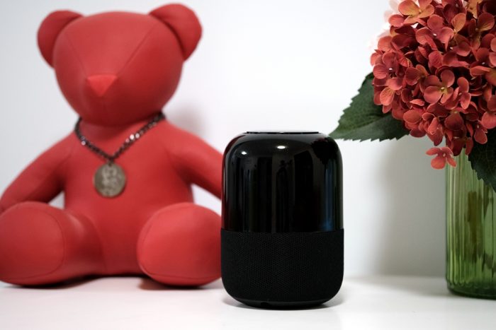 华为AI音箱2有太空黑和星云白两种颜色版本,外观采用了和华为Sound X一样的圆柱两段式设计,机身的上半段外壳采用了ABS材质,做了钢琴烤漆处理,而下半段则是扬声器喇叭,网罩表面是一层3D包覆飞织网布,整体看上去比较有质感和档次。