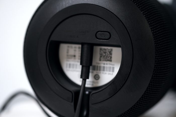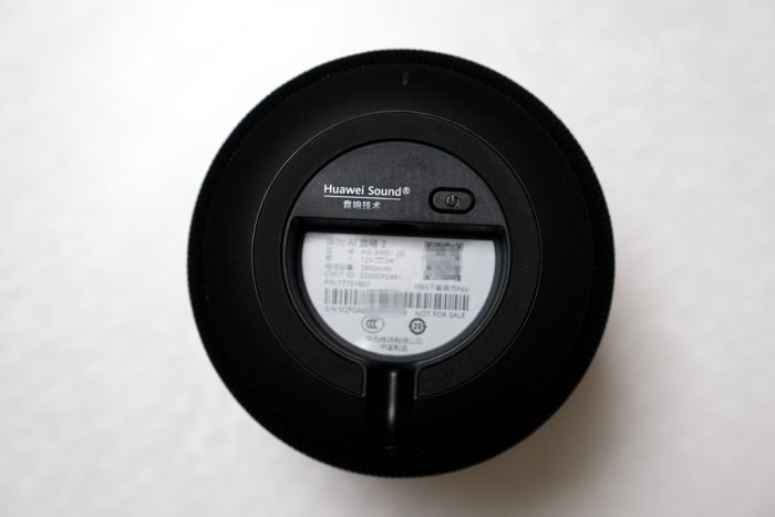 华为AI音箱2的电源开关键和电源插孔都安排在机身的底部,中间采用凹槽设计,贴有产品的名牌,当电源线插入之后,可以很好地隐藏其中,边上的预留口方便走线整理。此外,底部还设有防滑硅胶垫,音箱放置桌面时更加地稳固。