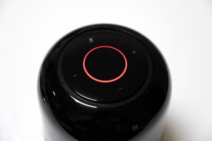 操控面板的正中间还设有一个环形指示灯,通过灯光的颜色可以判断音箱的工作状态,如红色灯代表静音,绿色灯的则是进入网络配对状态,而蓝色灯则是联网成功。每次点击按键时,指示灯会自动亮起,带来了一丝的科技感。
