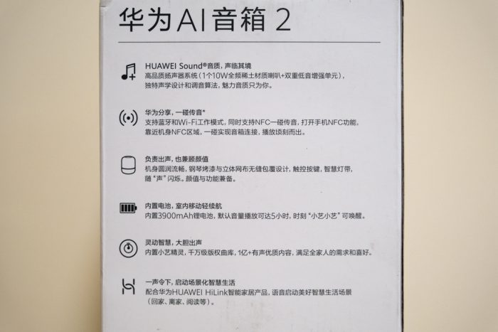 华为AI音箱2采用质地结实的白色纸盒包装,盒子的正面印有音箱的矢量图,背面则印有这款智能音箱的主要亮点,其中包括内置3900毫安锂电池。我以前用过不少智能AI音箱,它们都因为需要联网而必须使用有线的电源适配器进行供电,而像华为AI音箱2这样既摆脱电源线束缚,又能实现联网的智能AI音箱,我是头一回接触。