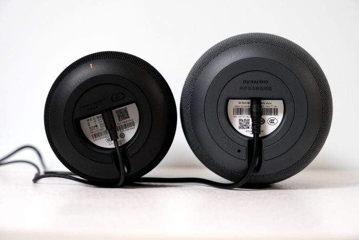 两款音箱的底部区别就在于华为AI音箱2设有电源开关键,而去掉了复位孔,而华为AI音箱则是由复位孔而去电源开关键。