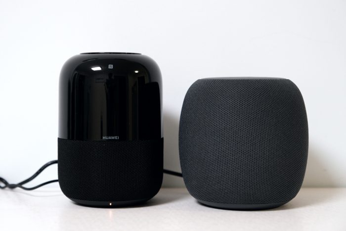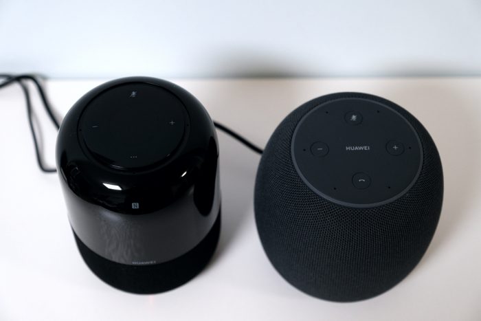 我手上刚好有华为AI音箱,所以拿出来与华为AI音箱2摆在一起拍几张照片,让大家更加直观地了解它们外观的不同之处。华为AI音箱的直径比华为AI音箱2更大些,但高度低一些,音箱的侧面全是织布面料,相比起来,华为AI音箱2确实是颜值更高一些,更有科技数码气息。
