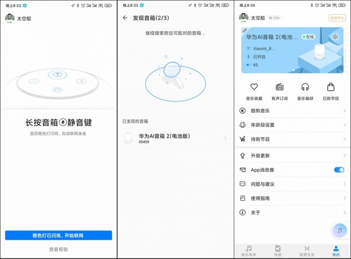 最后来谈谈华为AI音箱2的配套手机App,手机扫描机身底部的二维码或者在手机的应用商店里搜索即可下载AI音箱App。初次运行,需要进行设备绑定操作,步骤比较简单,有向导的指引。只不过要注意的是,华为AI音箱2只支持2.4GHz网络。