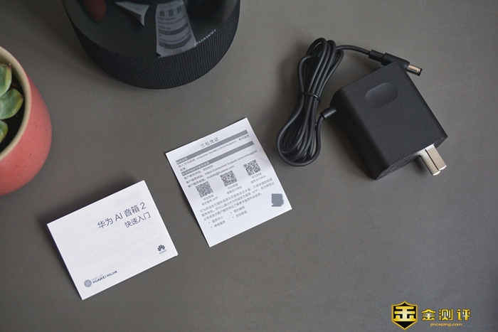 华为AI音箱2的包装内配件不是很多,除了电源线和说明书、保修卡就没有其他了。
