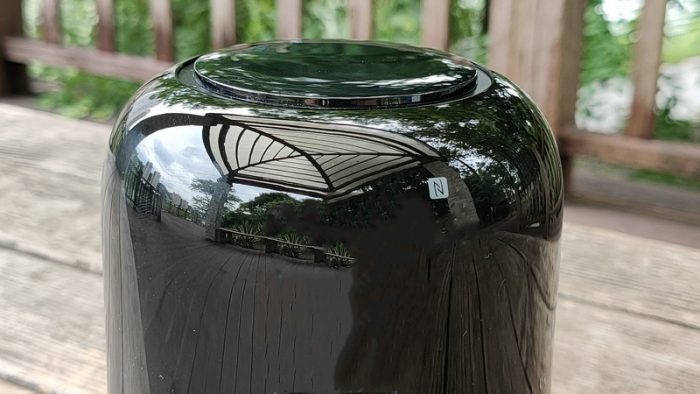在音箱的顶部外壳采用钢琴烤漆的制作工艺,表面光洁的如同镜子一般可以清晰的反射出四周的景物。侧顶端的侧壁上印有NFC的Logo图标处就是为用户提供一触传音的功能节点,并且顶部同样采用触控方式分别设置了四枚按键,分别是音量+、音量-和多功能键、静音键,而在中间空置区域内隐藏了红、绿、蓝三种颜色的LED指示灯,通过不同的色彩可以大致区分出音箱当前所对应不同的功能。